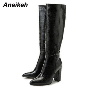 Aneikeh Pointed Thick Heels Knee Long Boots Women's 2024 Spring/Autumn Patent Leather Crocodile Pattern Panel Side Zipper Boots
