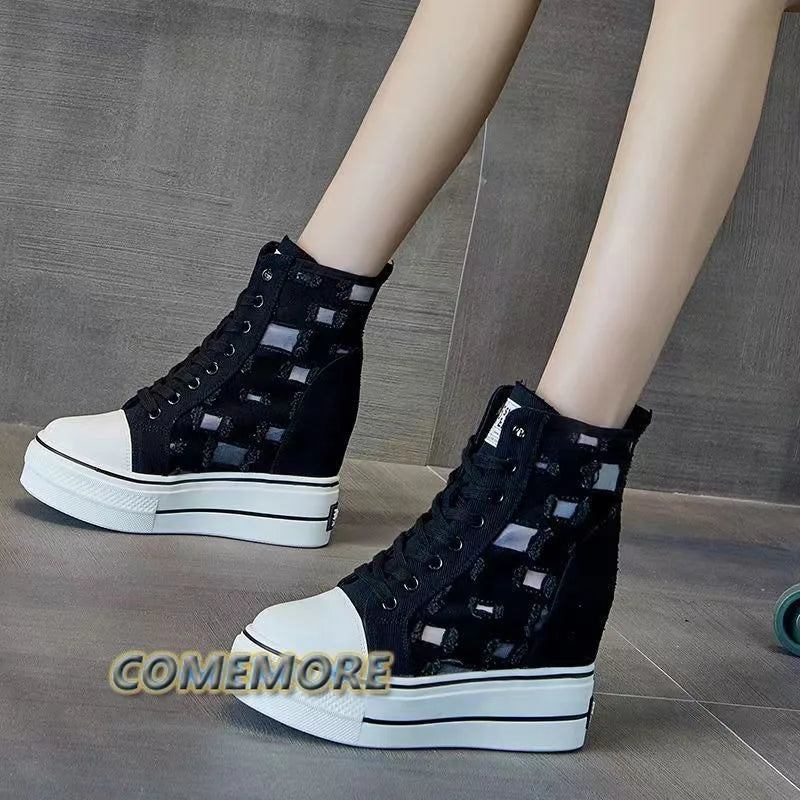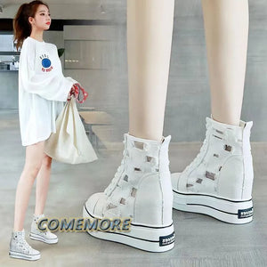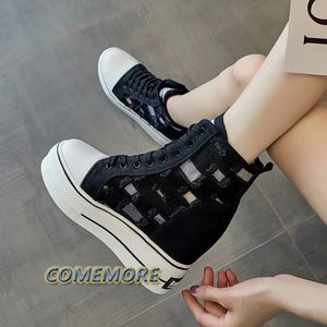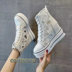 Inner Increase White Shoes 2023 New High-top Canvas Spring Autumn Women Hollow Breathable Casual Thick-soled Women Sneaker Shoes