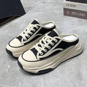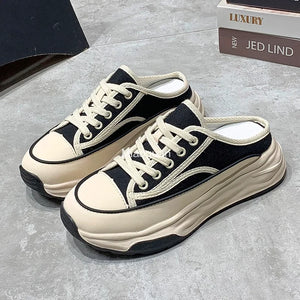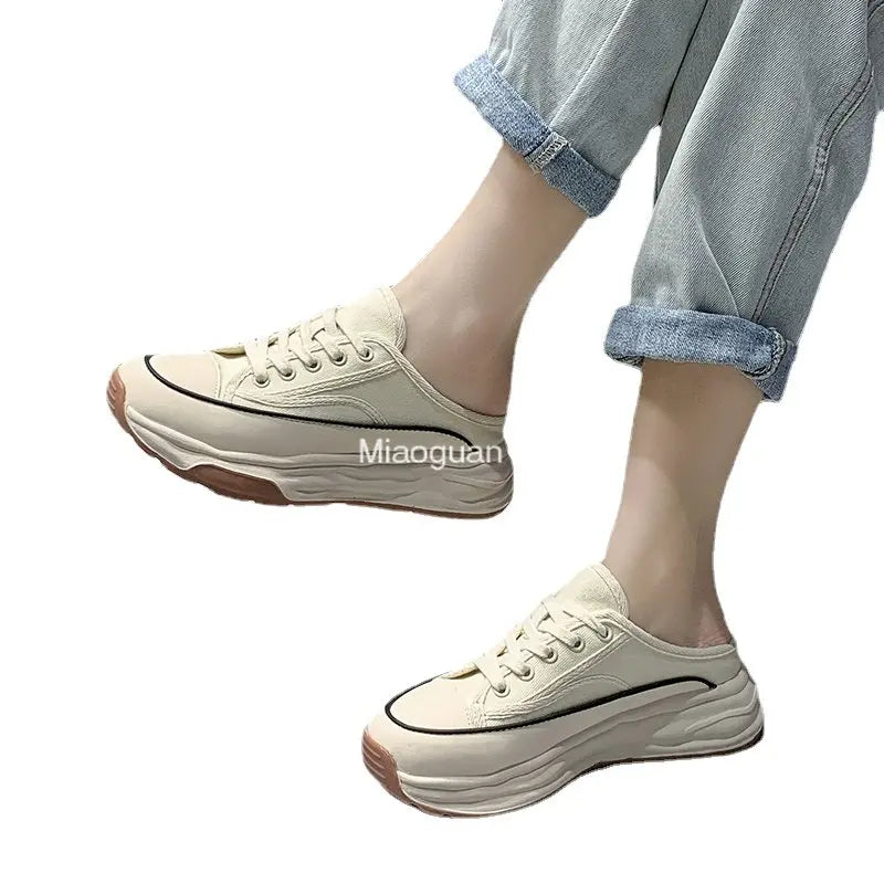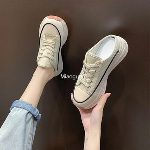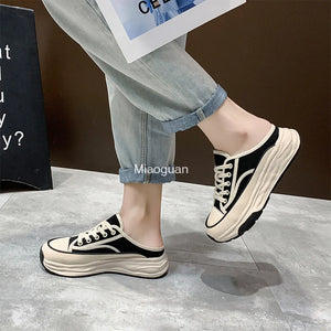 Ladies Slippers 2022 Summer Baotou Half Slippers Woman's Versatile Casual Lace Up Canvas Sports Slippers Platform Shoes Outside