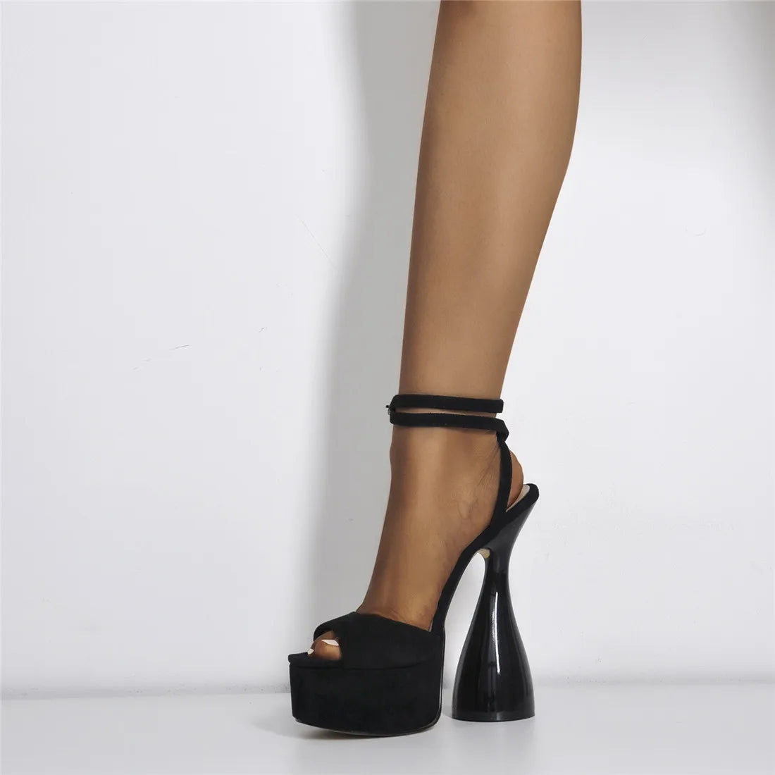 Onlymaker Women Peep Toe Sandals Black Flock Platform Ankle Strap High Heel Shoes Female Big Size Party Dress Sexy Sandals