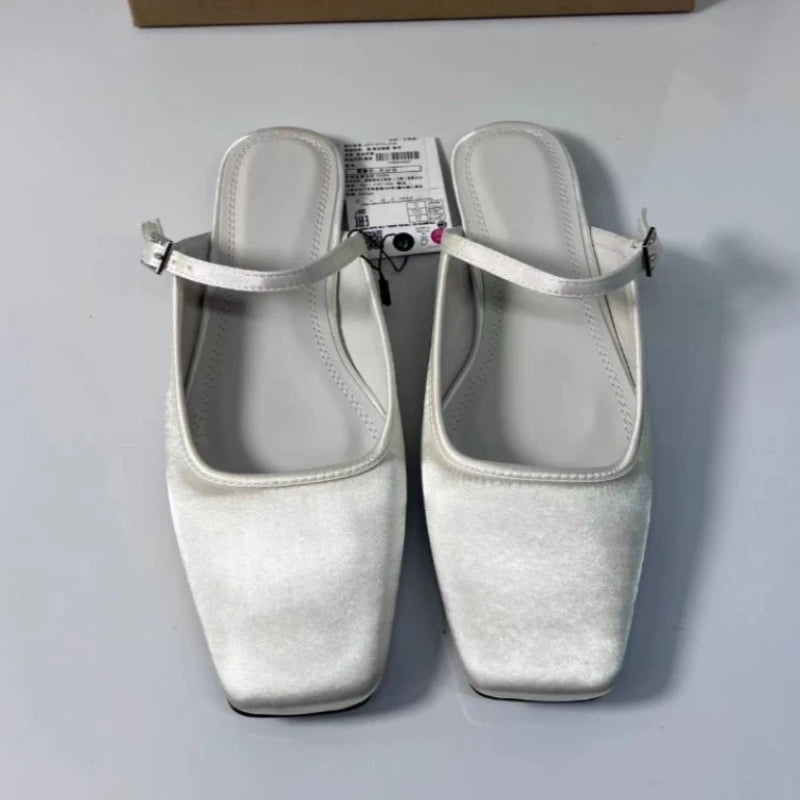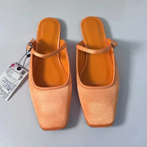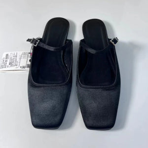 Summer Flat Sandals Woman 2025 New Square Toe Buckle Strap Breathable Satin Leisure Slingbacks Chic Mules Shoes for Ladies