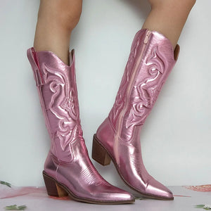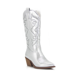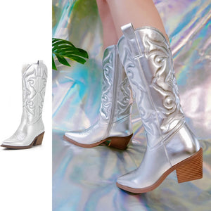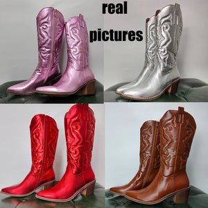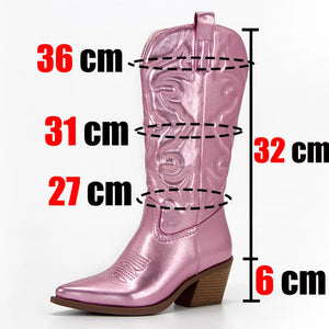 Bottes Western Cowgirl Vintage Automne Hiver Neuves à Talons Épais Bottes de Cowboy Mi-Mollet Femme Chaussures Décontractées Pour Femme