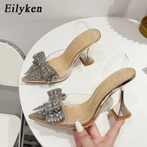 Eilyken Fashion Crystal Sequined Bowknot Women Pumps Sexy Pointed Toe High Heels PVC Transparent Sandals Wedding Prom Shoes