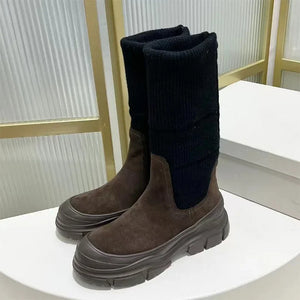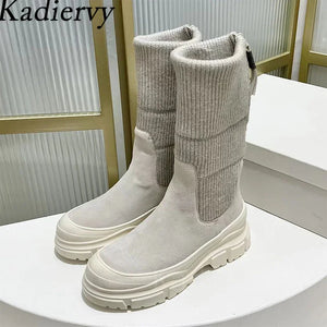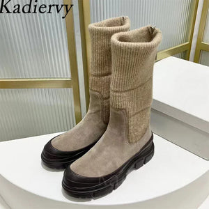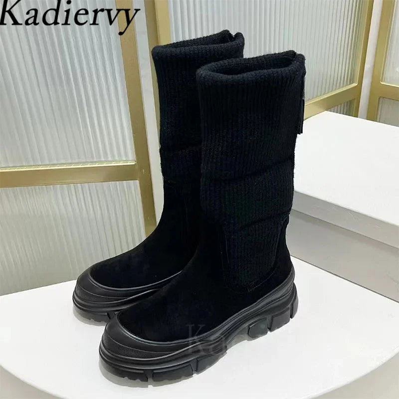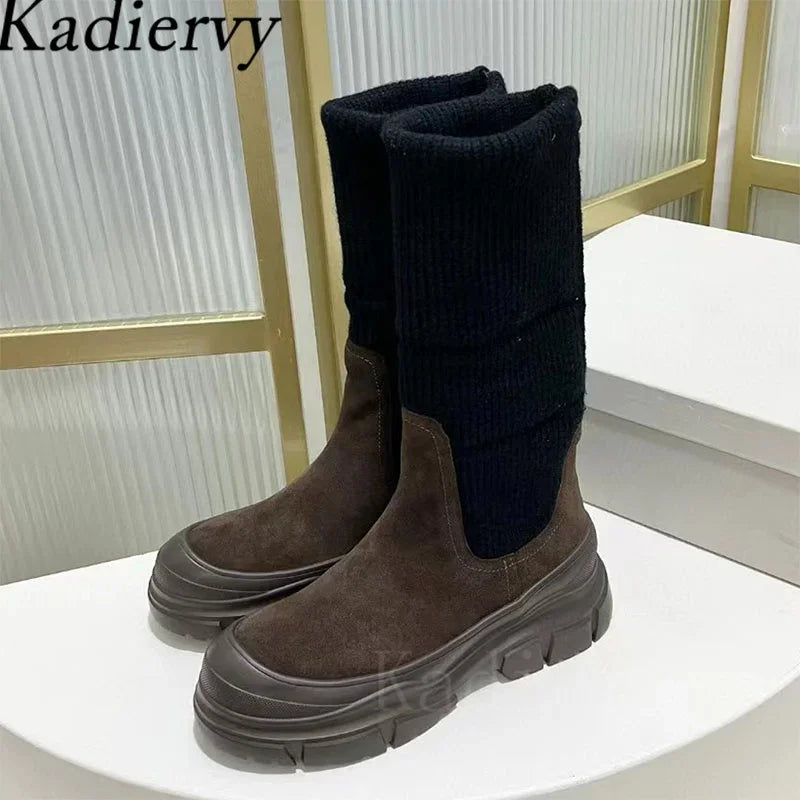 Luxury Thick Sole Motorcycle Boots Women Round Toe Flat Platform Shoes Women Cow Suede Patchwork Knit Mid Calf Boots Woman