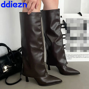 Party Modern Ladies Knee High Boots Pointed Toe Fashion Pleated Western Women Long Boots Shoes Female Pumps Heels Shoes