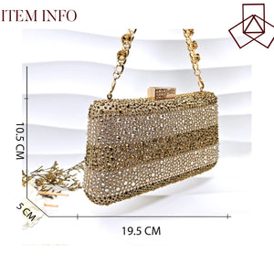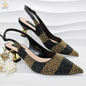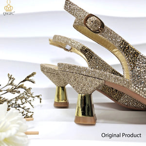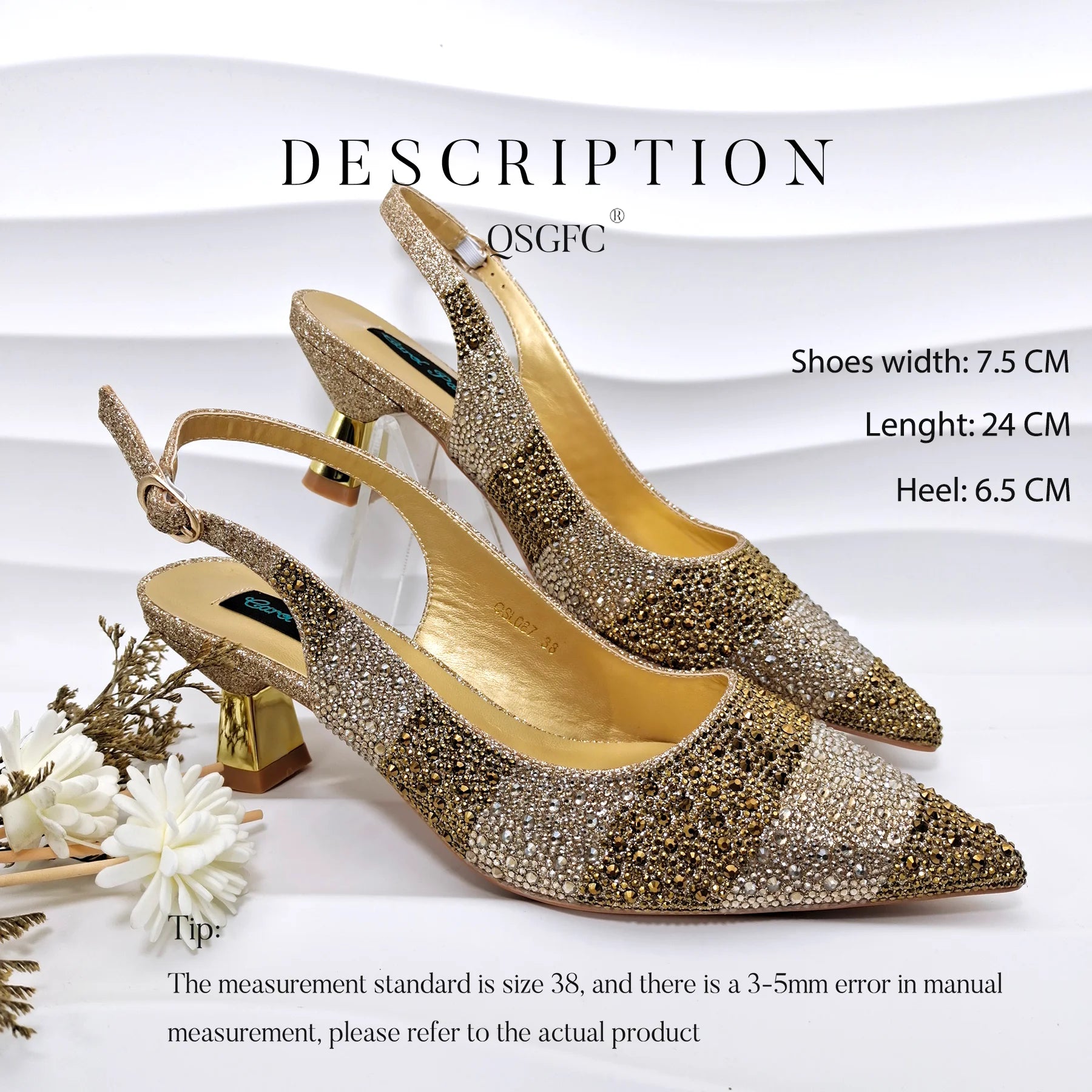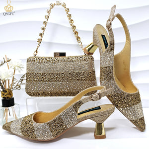 QSGFC INS Ensemble de chaussures à talons élégants pour femmes en couleur or et sac assorti, chaussures à talons hauts en forme de coin avec strass creux