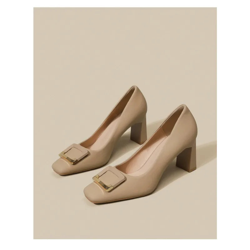 Spring new square head thick heels women's shallow mouth buckle single shoes professional shoes high heels
