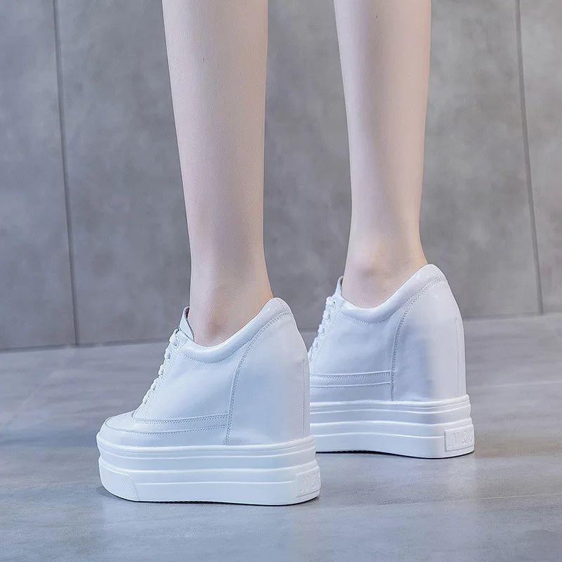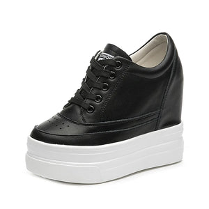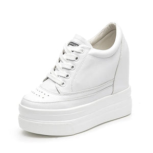 Women Autumn Leather 11cm Hidden Wedge Sneakers Platform Shoes High Heels Sneakers Female Casual Footwear White Woman Trainers