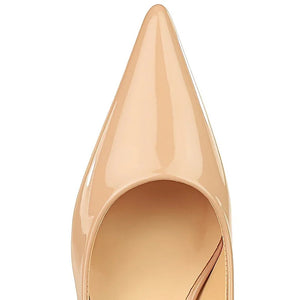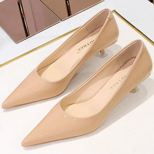 Escarpins à talons hauts sexy de 4,5 cm pour femmes, chaussures à talons chaton bas, bout pointu et peu profond, en cuir brillant, rouge et nude