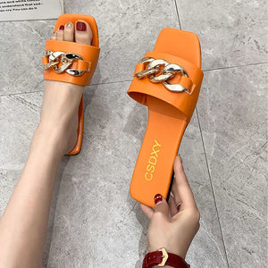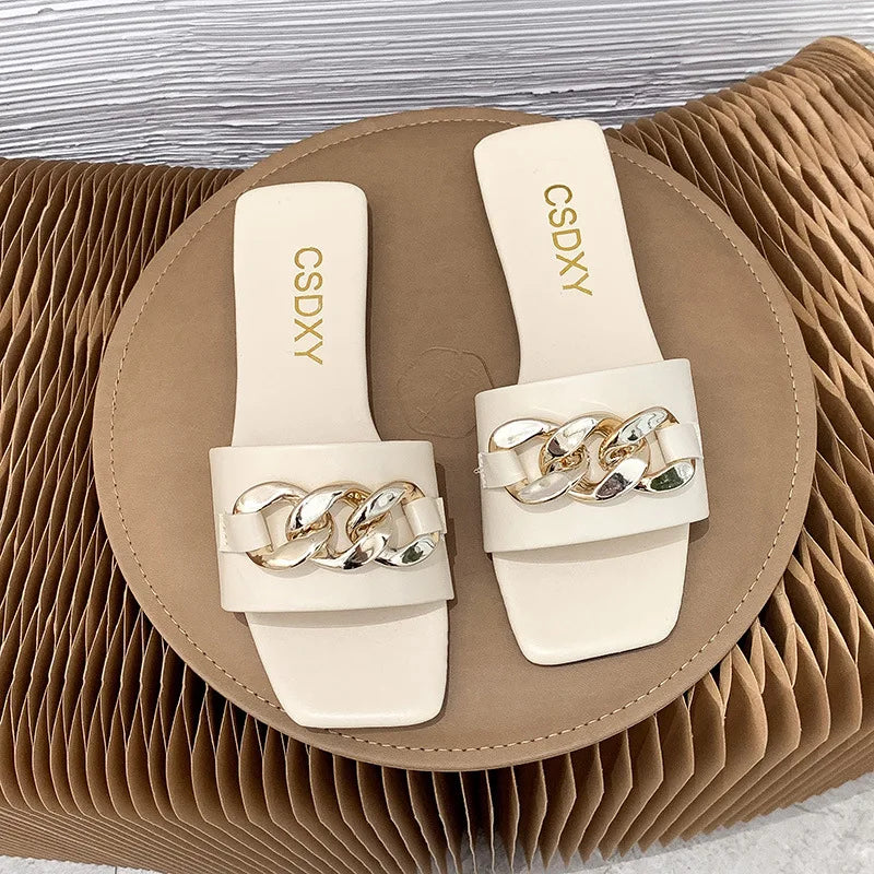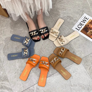 2022 New Fashion Women's Slippers Square Toe Chain Slippers Flat Slide Sandals Beach Flip Flops Metal Decoration Casual Shoes