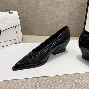 2023 Fall and Winter Slope Heel Pointed Toe V Mouth Women's Single Shoes Black 4cm Women's Shoes Middle Heel Retro Granny Shoes