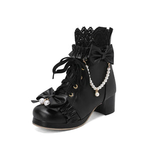 2023 new autumn winter Women ankle boots plus size 22-28CM pu upper modern boots lace Pearl Chain Bow Lolita thick heel boots