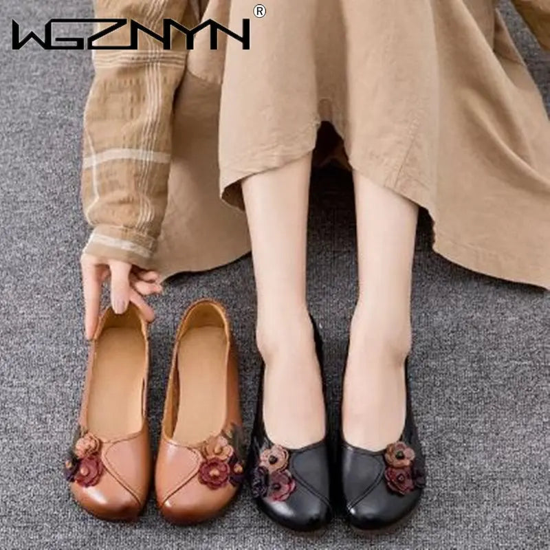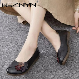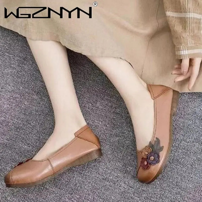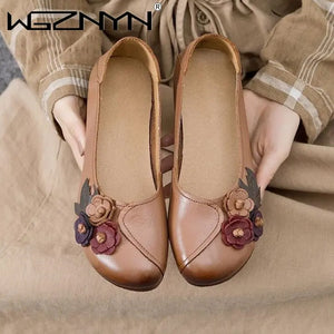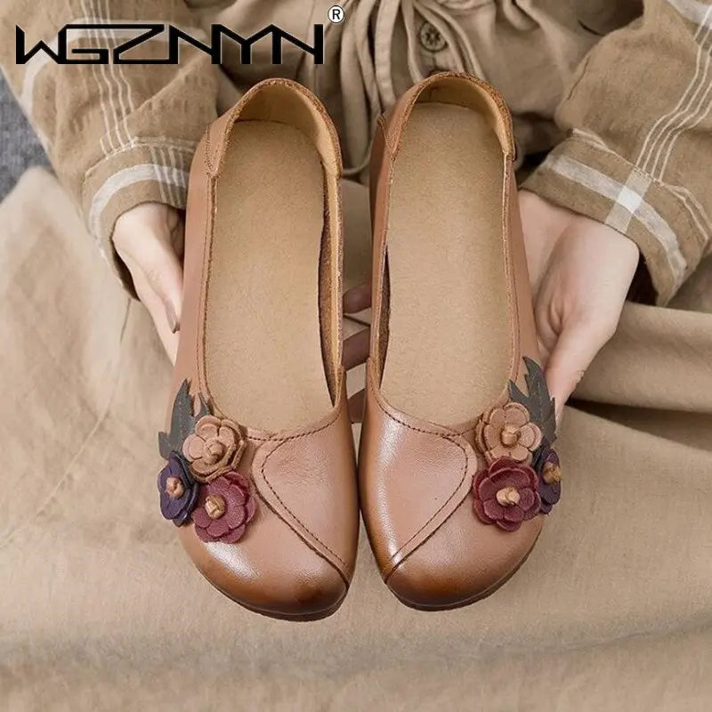 2023 Vintage Floral Ballet Flats Women's Genuine Leather Shallow Shoes Mom Driving Loafers Ladies Retro Cozy Moccasins Sneakers