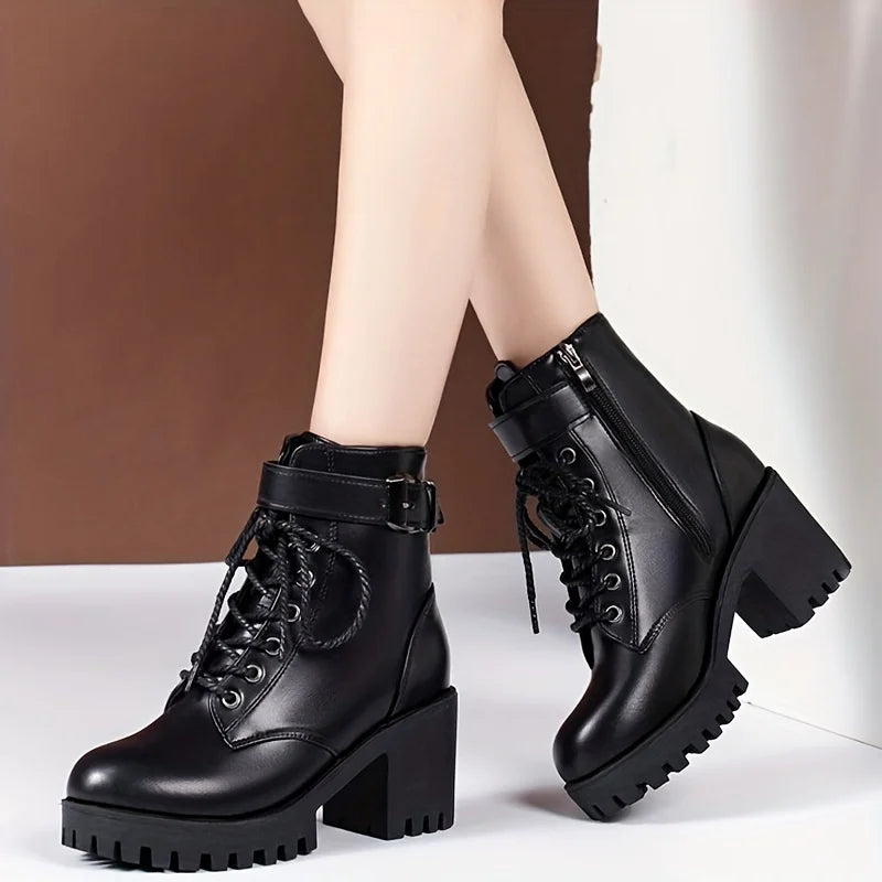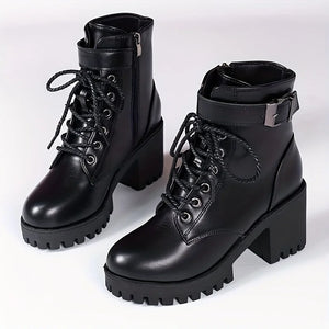 2023 Women's Solid Chunky Heel Boots Fashion Lace Up Shoes for Women Side Zipper Boots Stylish Buckle Strap Detailed Ankle Boots