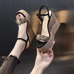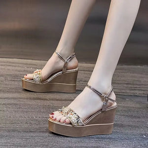 2024 Summer New Slope Heel Sandals Women's Thick Sole Waterproof Platform Water Diamond Straight Line Fashion Sandals