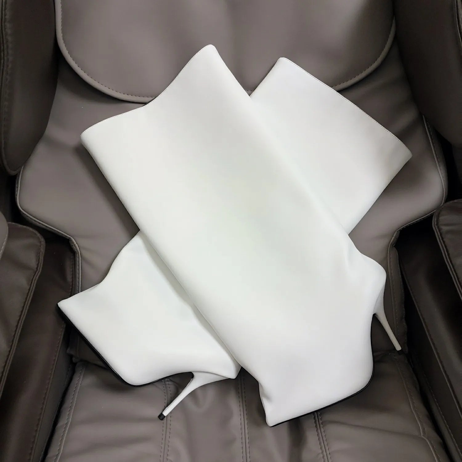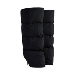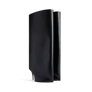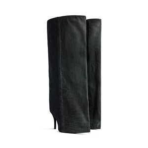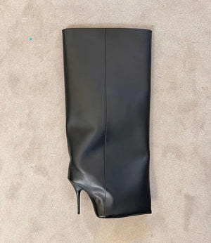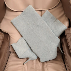 2024 Winter New in Black Leather Wader Boots Pointed Toe High Heels Pull on Knee High Boot Denim Luxury Design Women Down Shoes