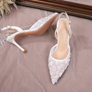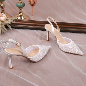 2025 Summer Lace Beaded Wedding Shoes Back Strap High Heels Bridesmaid Sandals For Women French Party Heels