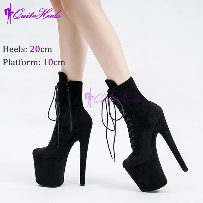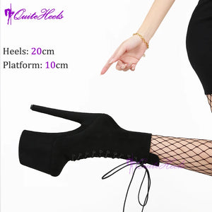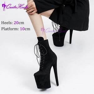 20cm Sexy Black Platform Pole Dance Shoes Stripper Heels Suede Ankle Boots High Heels Laces Round Toe Low Leg