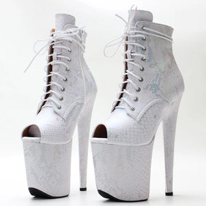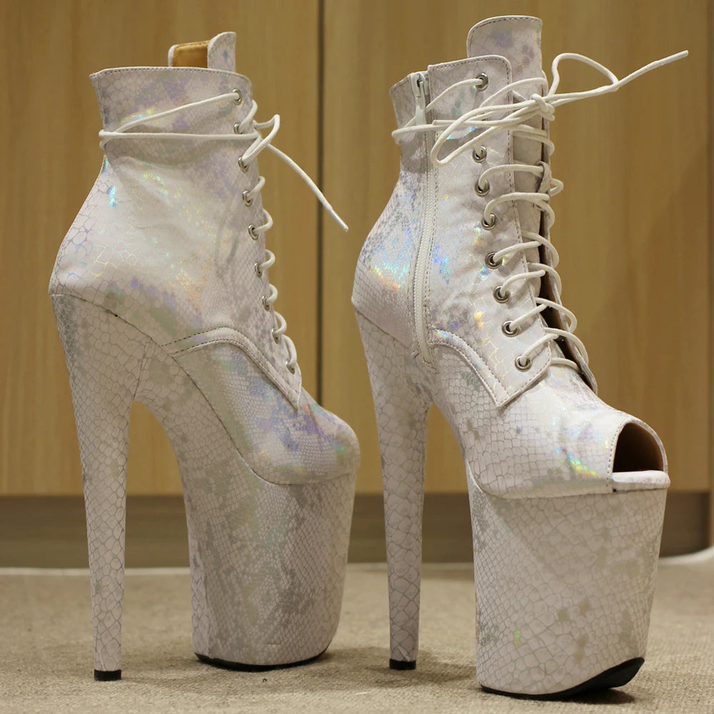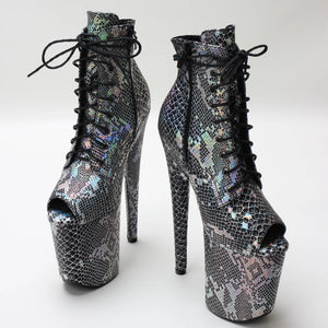8 Inch (200mm) Heel, 4 Inch (100mm) Platform Lace-Up Front Pole Dancing Ankle Boot With Hologtaphic Serpentine Print Upper