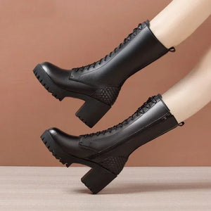 8cm 10cm Small Size 32-43 Genuine Leather Boots Womens Platform Shoes with Fur 2024 Block High Heels Mid Calf Boots Office Model