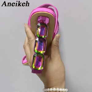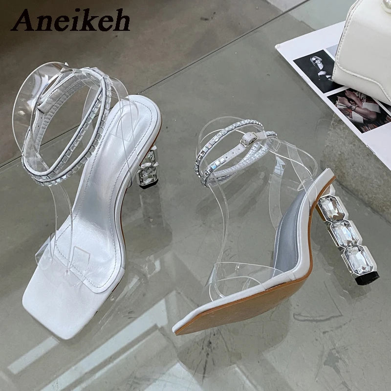Aneikeh Sexy Sparkly Stacked Crystal Heel Sandals Woman Summer 2024 Thin Embellished Ankle Straps High Heel Shoe for Women Pumps