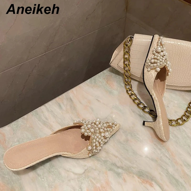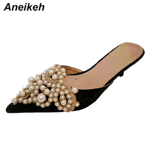 Aneikeh Spring/Autumn Fashion Sexy Women Shoes Elegant String Bead Crystal Patchwork Slip-On 35-42 Thin Heels Slipper NEW 2025