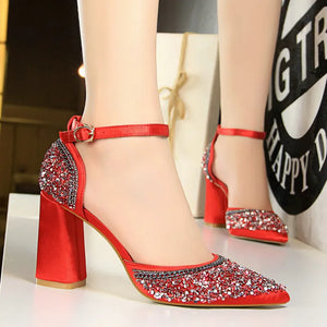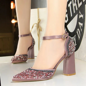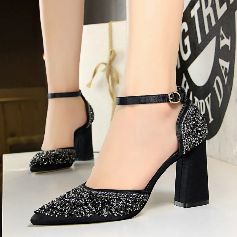 Ankle Strap High Heel Shoes Women Chain Design Sexy Pointed Toe Sandals Woman Square Heel High Shoes Ladies Shoes