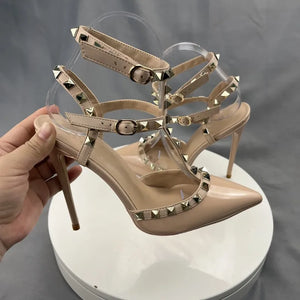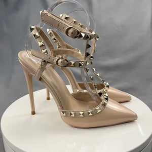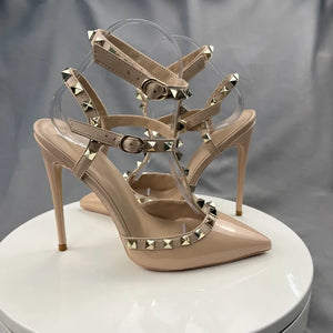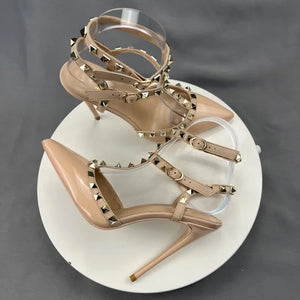 Beige Square Rivets T-Strapy Women Sandals New High Heels Sexy Party Wedding Pointed Toe Pumps Ankle Buckle Women