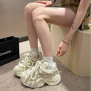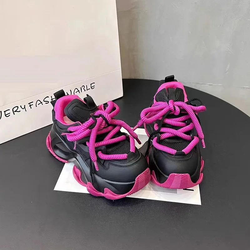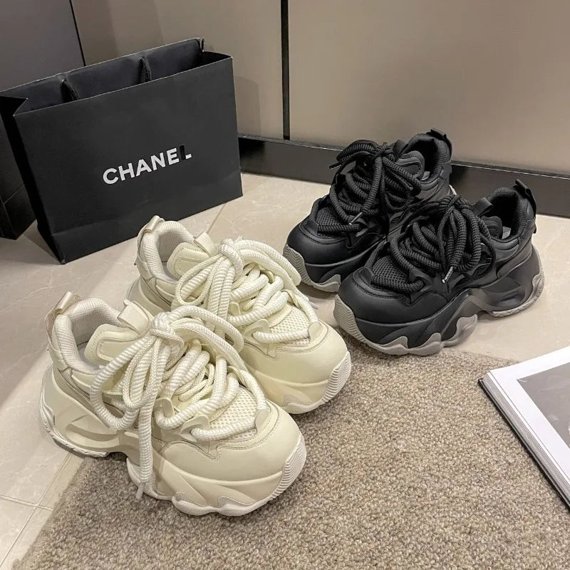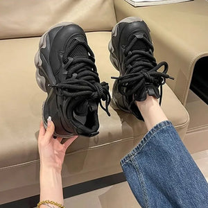 Black Platform Women's Sneakers 2024 Spring Lace-Up Thick Bottom Vulcanize Shoes Woman Pu Leather Breathable Sports Shoes Ladies