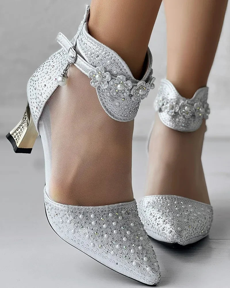Boots Women's Beaded Rhinestone Mesh Patchwork Pyramid Heel Ankle Mesh Sandals Versatile Heel Flower Shoes Mesh Breathable Pumps