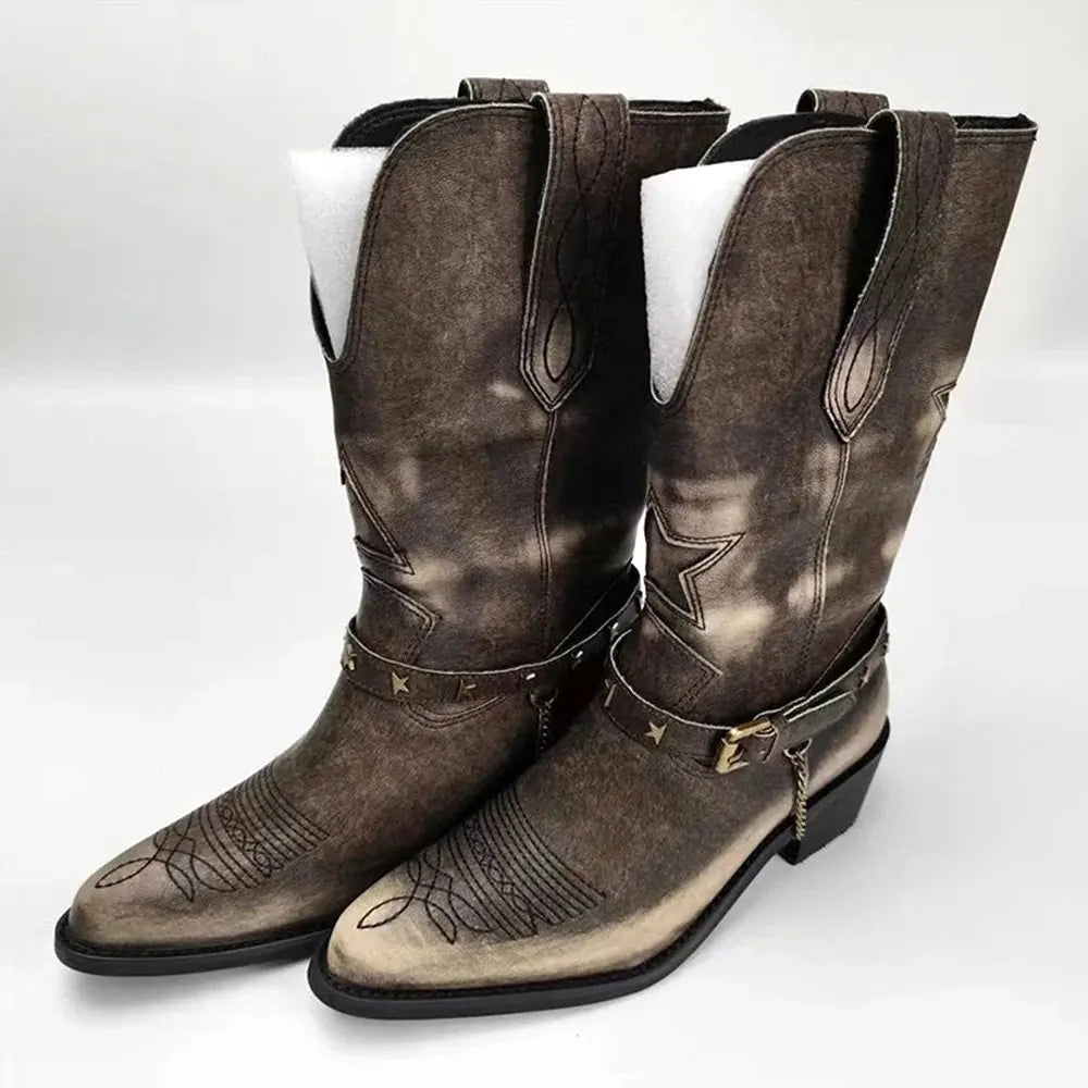 Brand New 2024 Vintage Maillard Style Boots Retro Wasteland Culture Cowboy Boots Women Square Heels Mid-calf Western Boot Shoes