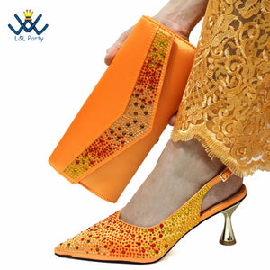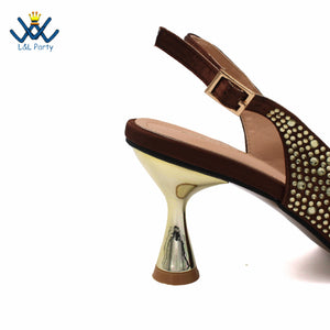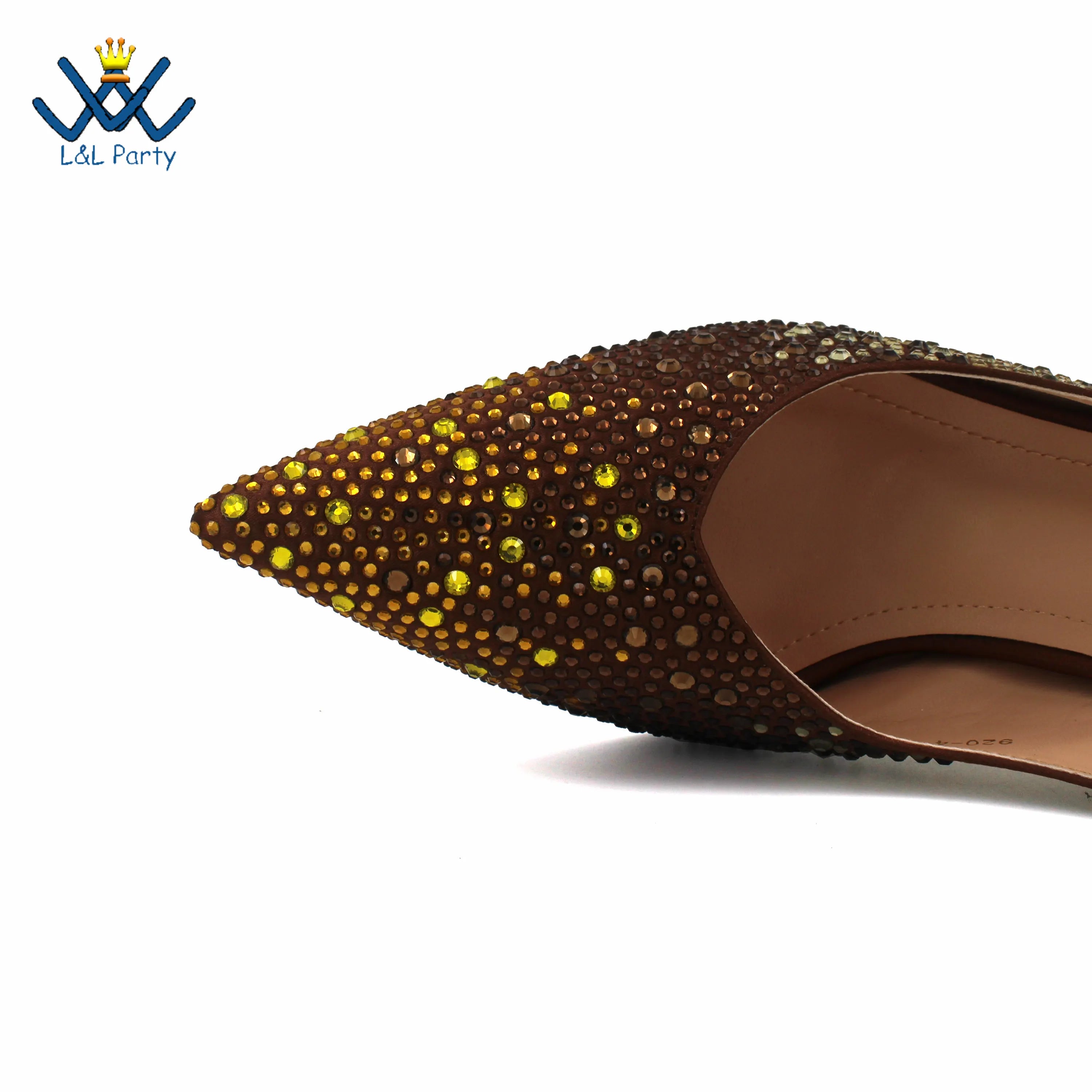 Coffee Color Fashion Italian Women Shoes and Bag Set High Quality New Full Shinning Crystal Slingbacks Pumps for Wedding