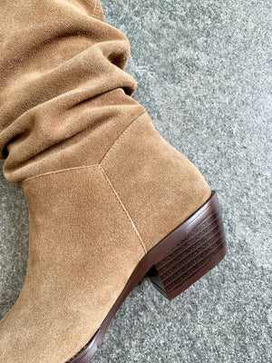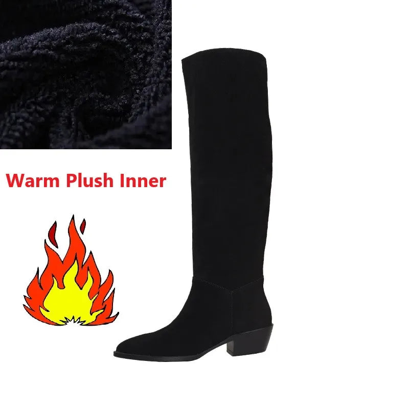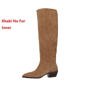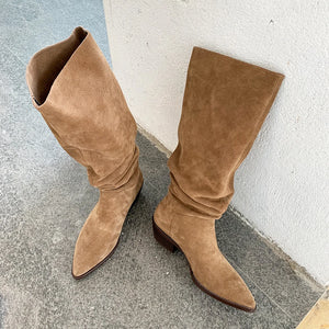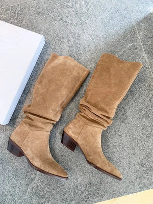 Cow Suede Daily Botas Pointed Toe Spring Autumn Woman Boots Cowgirls Western Boots Woman Slip On Simple Pleated Mid-Calf Shoes