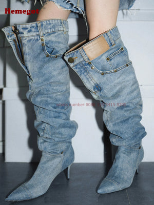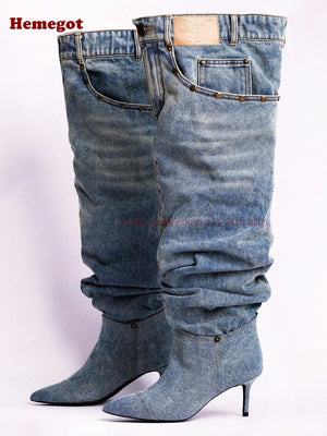 Denim Pants Boots Pointy Toe Pleated Over The Knee Boots for Women Winter 2024 Casual Rivet Pocket Decor Patchwork Luxury Shoes