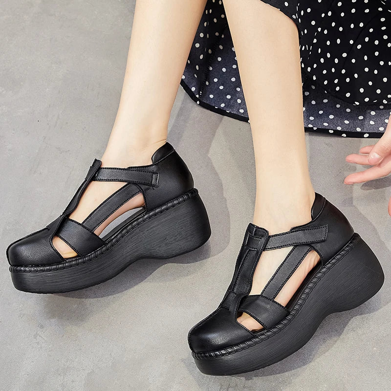DRKANOL Fashion Retro Summer Shoes Women Wedges Sandals Handmade Genuine Leather Hollow Platform Casual Sandals Female Black