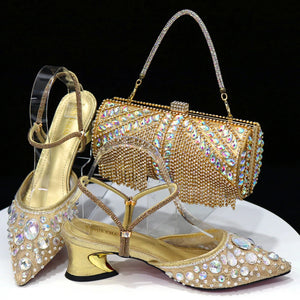 Fashion Gold Color Slippers Nigerian Party Italian Design Ladies Shoes and Bag Set Decorated With Rhinestone and Metal