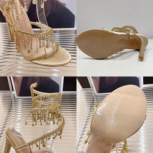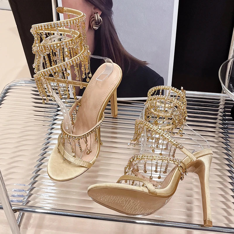 Golden Shoes Fashion Rhinestones Peep Toe Ladies High Heels Crystal Shoes Gladiator Sandals Women Thin Heels Female Footwear