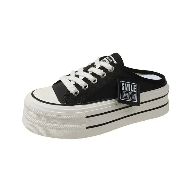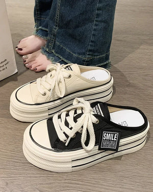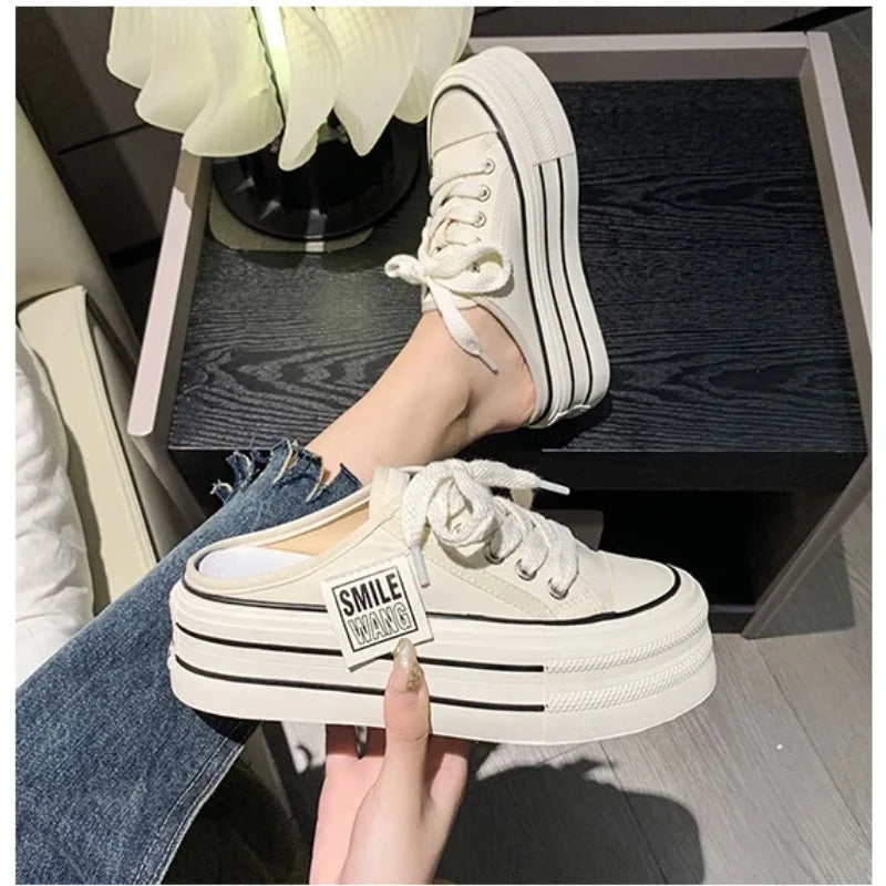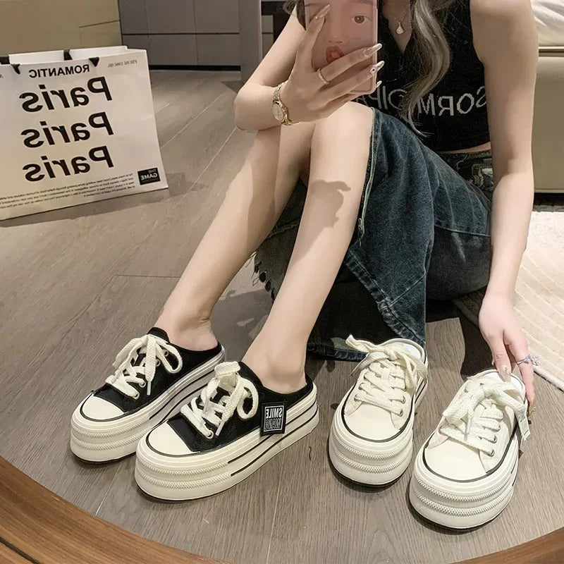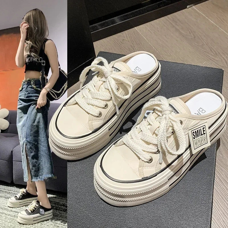 Height Increasing Platform Slippers Women Summer Outer Wear New Heel Free White Slides Canvas Shoes Slipper Slip on Sandals 5cm