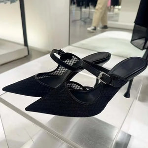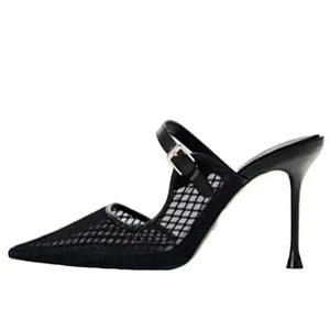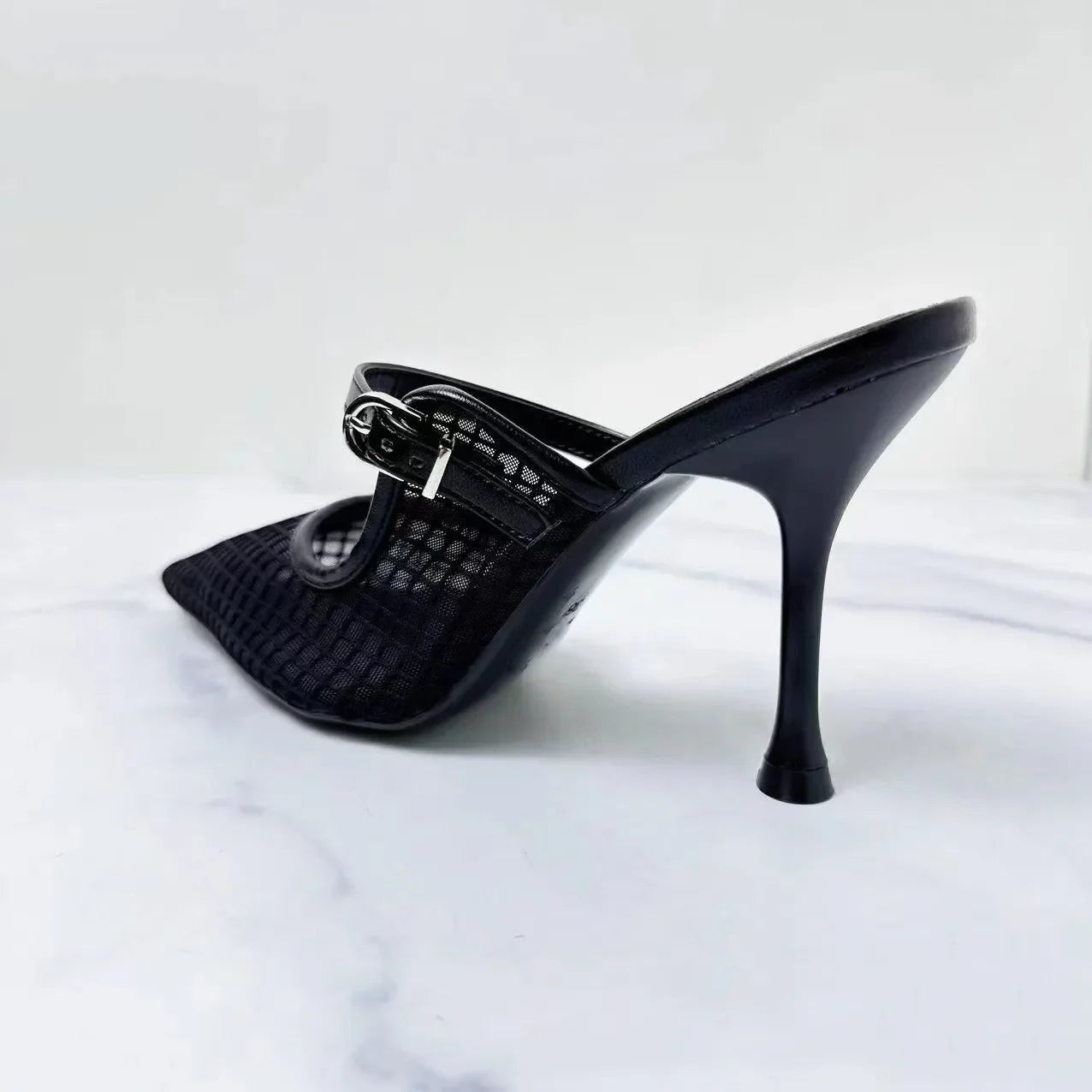 High Heels Mules Shoes for Laides Sexy Pointed Toe 2025 Summer Stilettos Black Hollow Breathable Mesh Vintage Women's Sandals