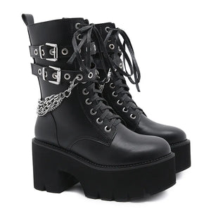 High Quality Leather Gothic Black Boots Women Heel Sexy Chain Chunky Heel Platform Boots Female Punk Style Ankle Boots Zipper