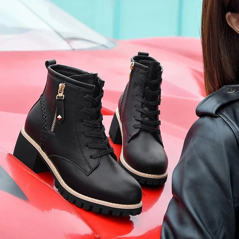 Hot Selling Women Shoes with Heel Boots Ankle Trend Autumn British Style Leather Thick Fur Ladies Short Boot Winter Footwear