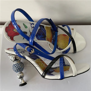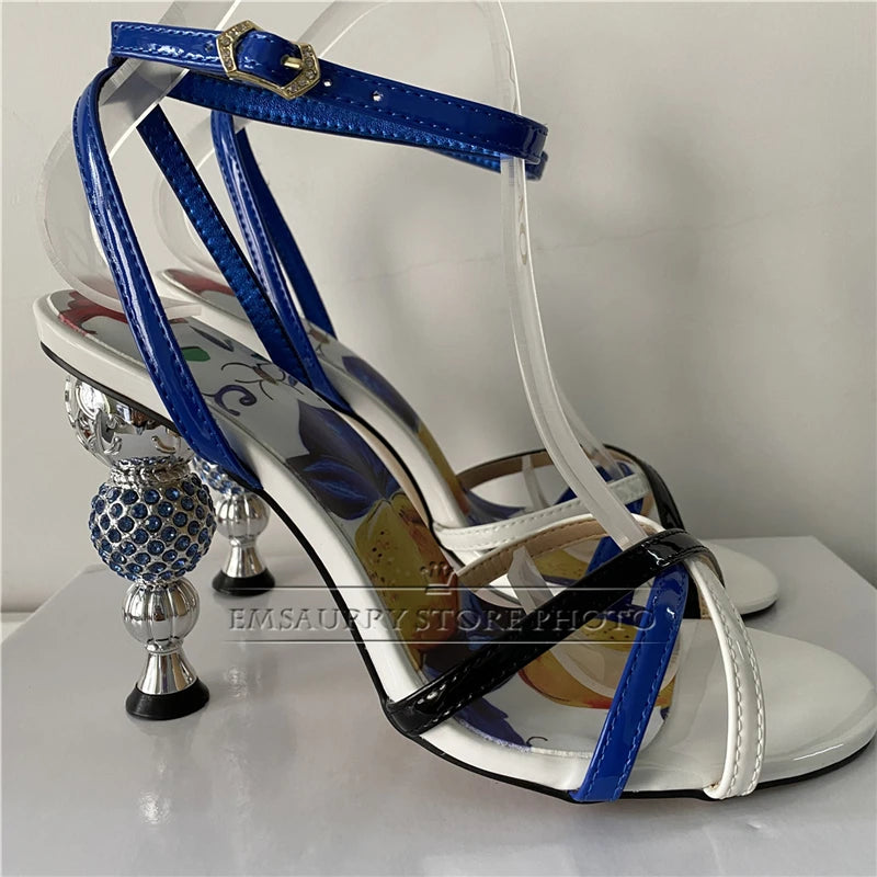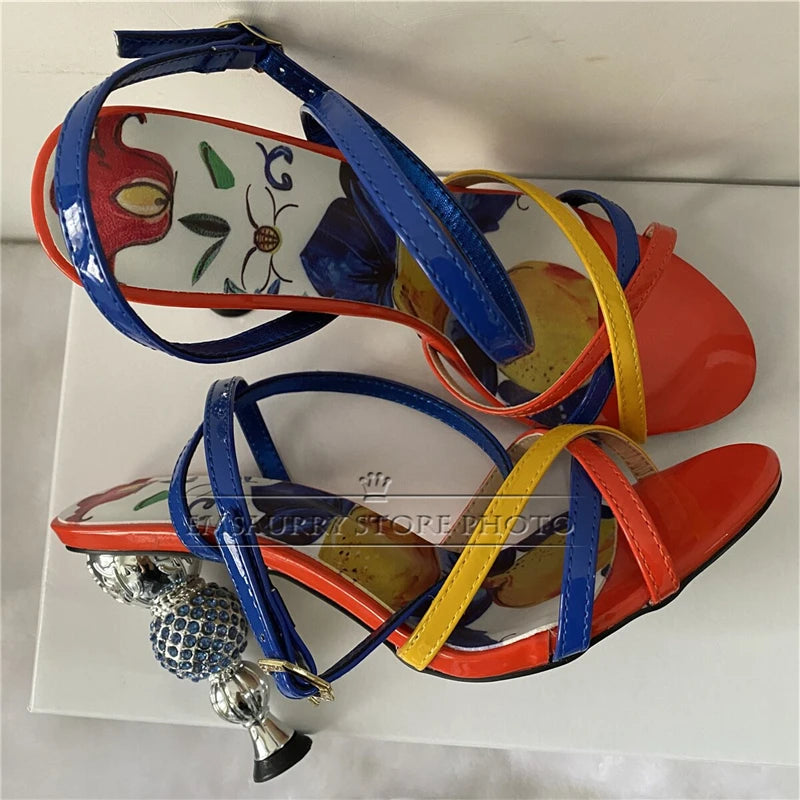 Jeweled Crystal Metal Strange Heel Sandals Women Sexy Cross Narrow Band Printed Flower Color 2024 Summer Banquet Shoes Woman