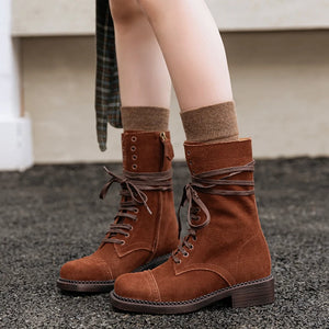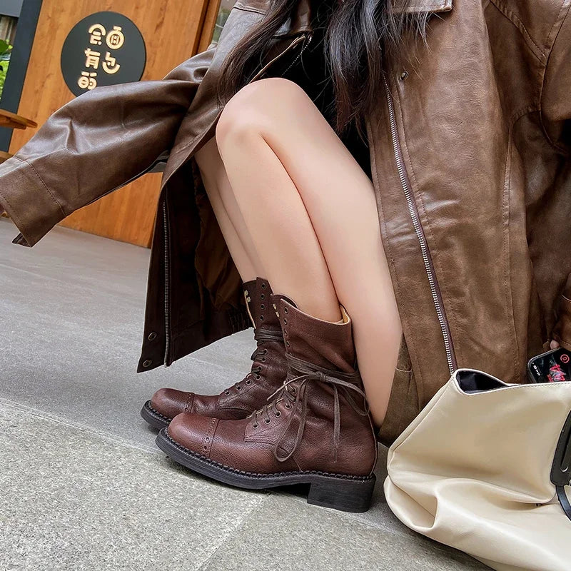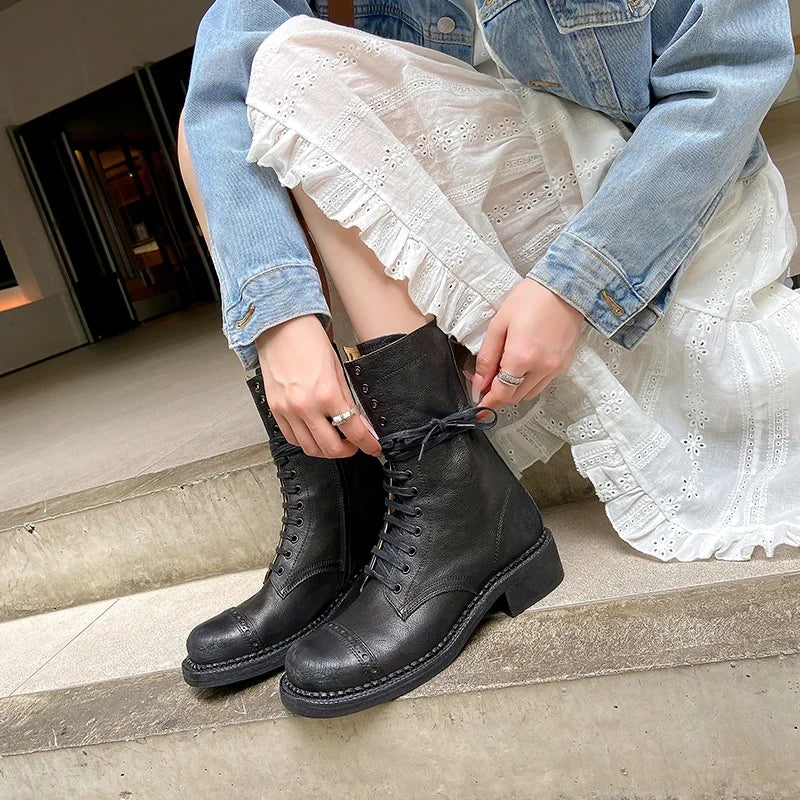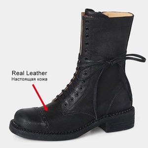 JOZHAMTA Size 34-42 Women Ankle High Boots Genuine Leather Lace-Up Thick Heels Shoes Fall Winter Platform Chelsea Short Booties