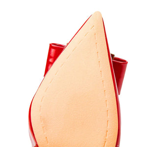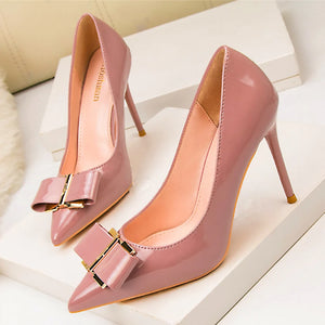 Korean Metal Bowknot Pointed Toe Women Pumps Fashion Patent Leather High Heels Shoes Black Red Shallow Wedding Shoes Party