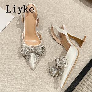 Liyke Spring Summer Fashion Rhinestone Bowknot Women Pumps Sexy Silk Pointed Toe Strange High Heels Party Prom Shoes Gold Silver