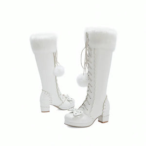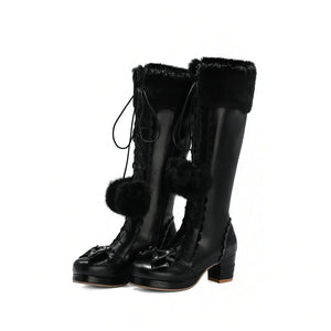 Lolita High Boots Winter Warm Fur Neck Girls Cosplay Party JK Princess Shoes Lace Up Bowtie Chunky Heel Side Zipper PU Leather