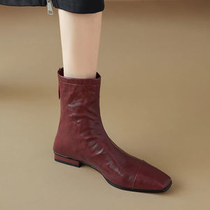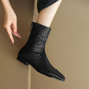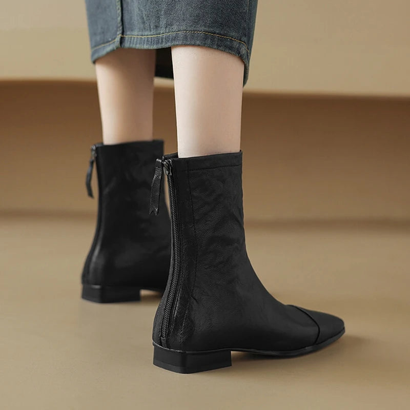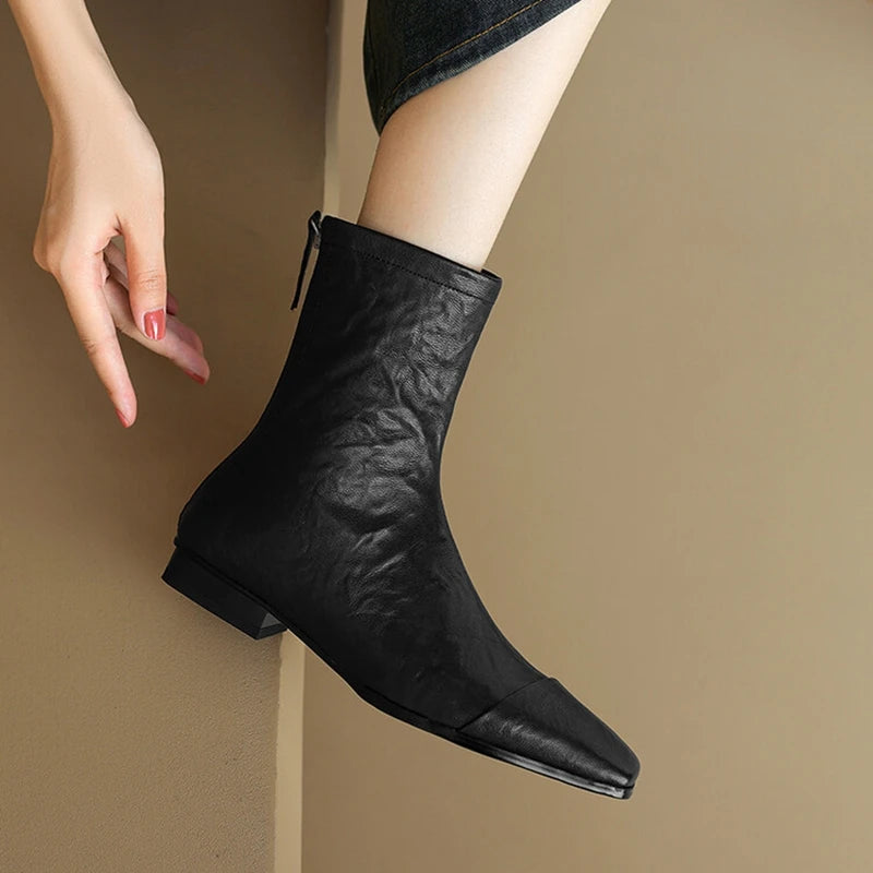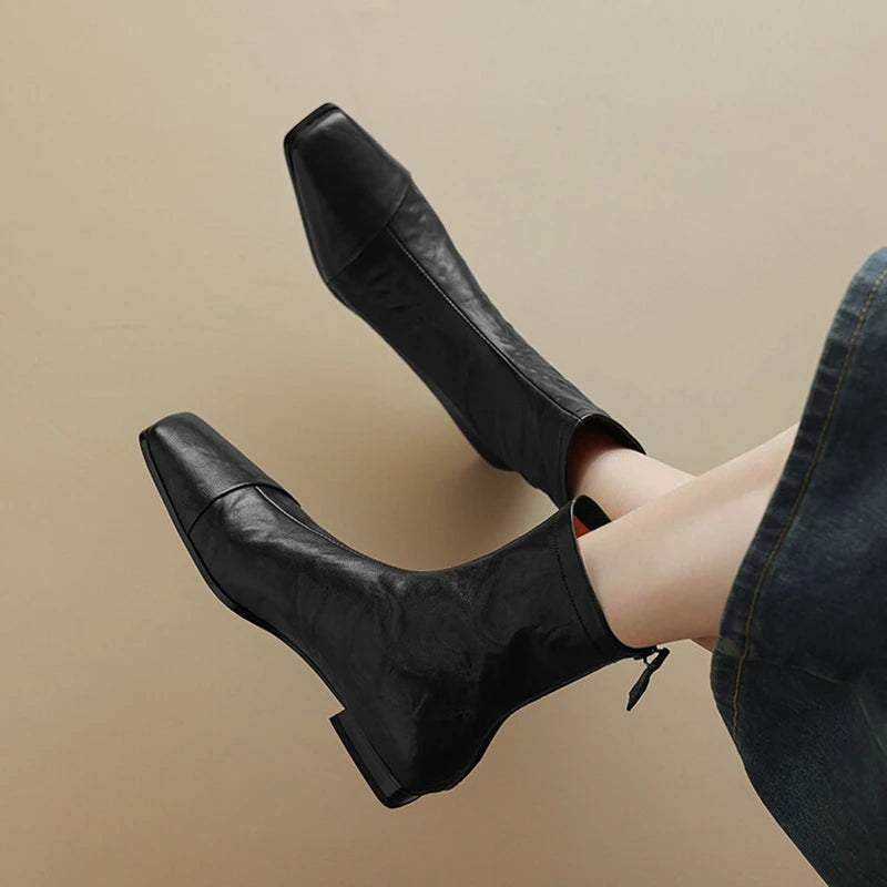 NEW Autumn/Winter Women Boots Square Toe Low Heel Shoes Genuine Leather Shoes for Women Concise Zipper Short Boots Modern Boots