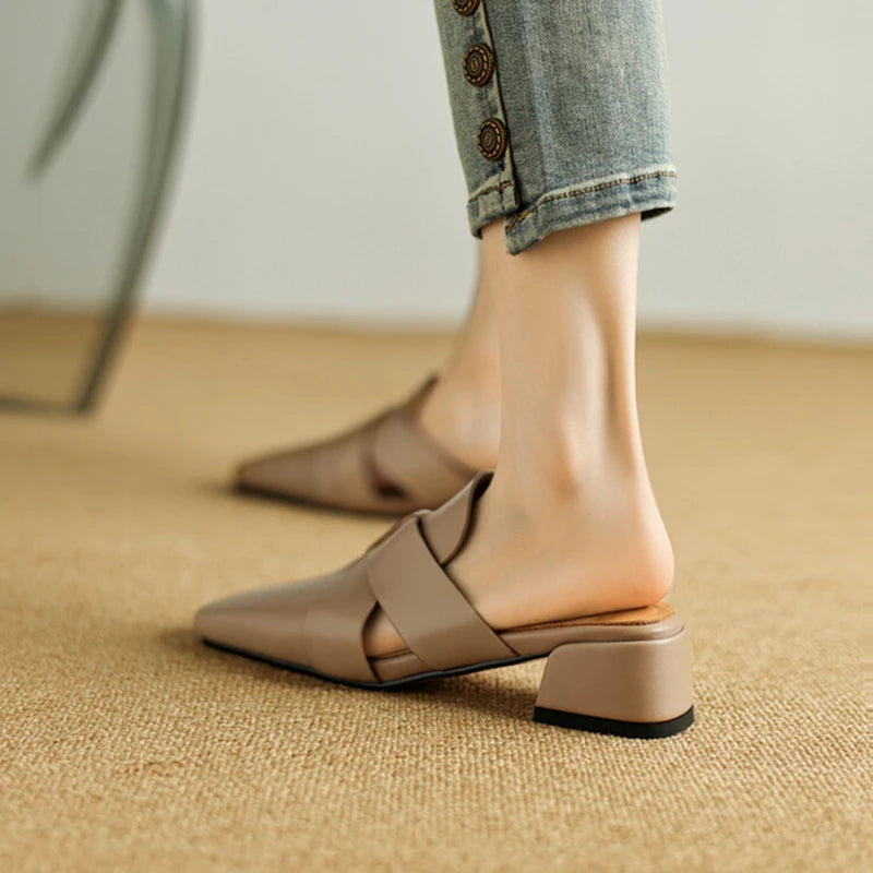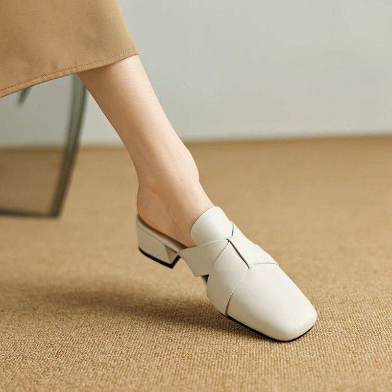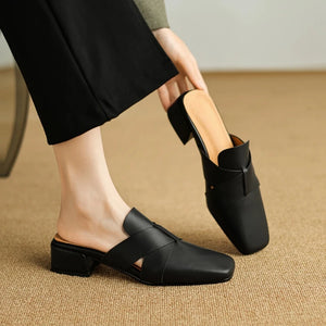 NEW Summer Women Mules Genuine Leather Shoes for Women Cover Toe Chunky Heel Slippers Concise Square Toe Handmade Modern Sandals