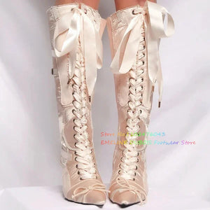 Nude and Pink Stain Knee High Boot Women Pointy Toe Eyelet Ribbon Decorative Laces Up Side Zipper Low Heel Girl Ballet Shoes