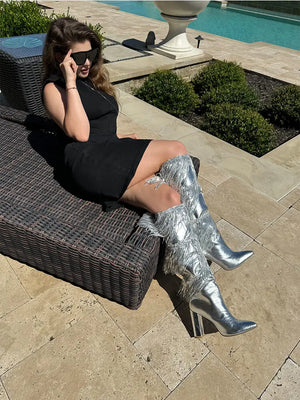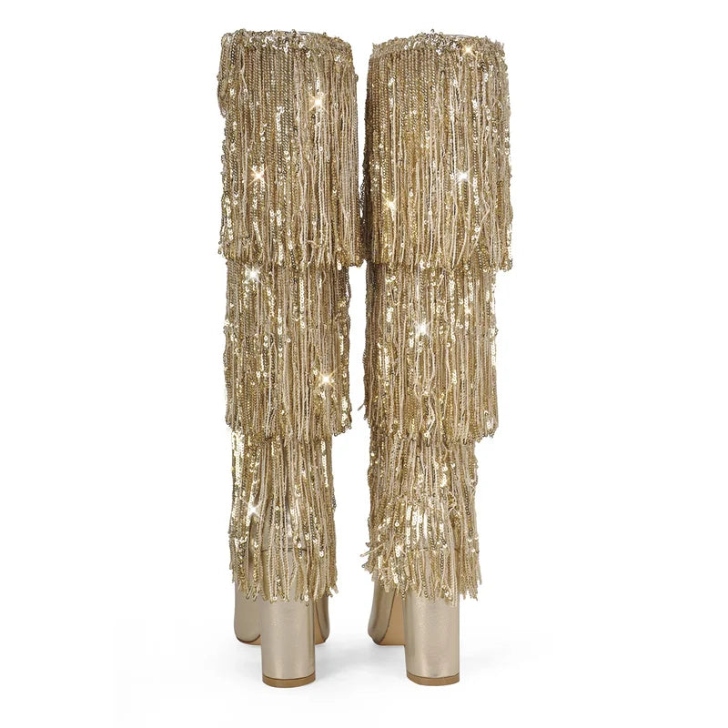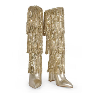 Onlymaker Women Pointed Toe Gold Fringe Metallic Slim Knee Boots Sexy Dance Party Dress Chunky Heel Boots